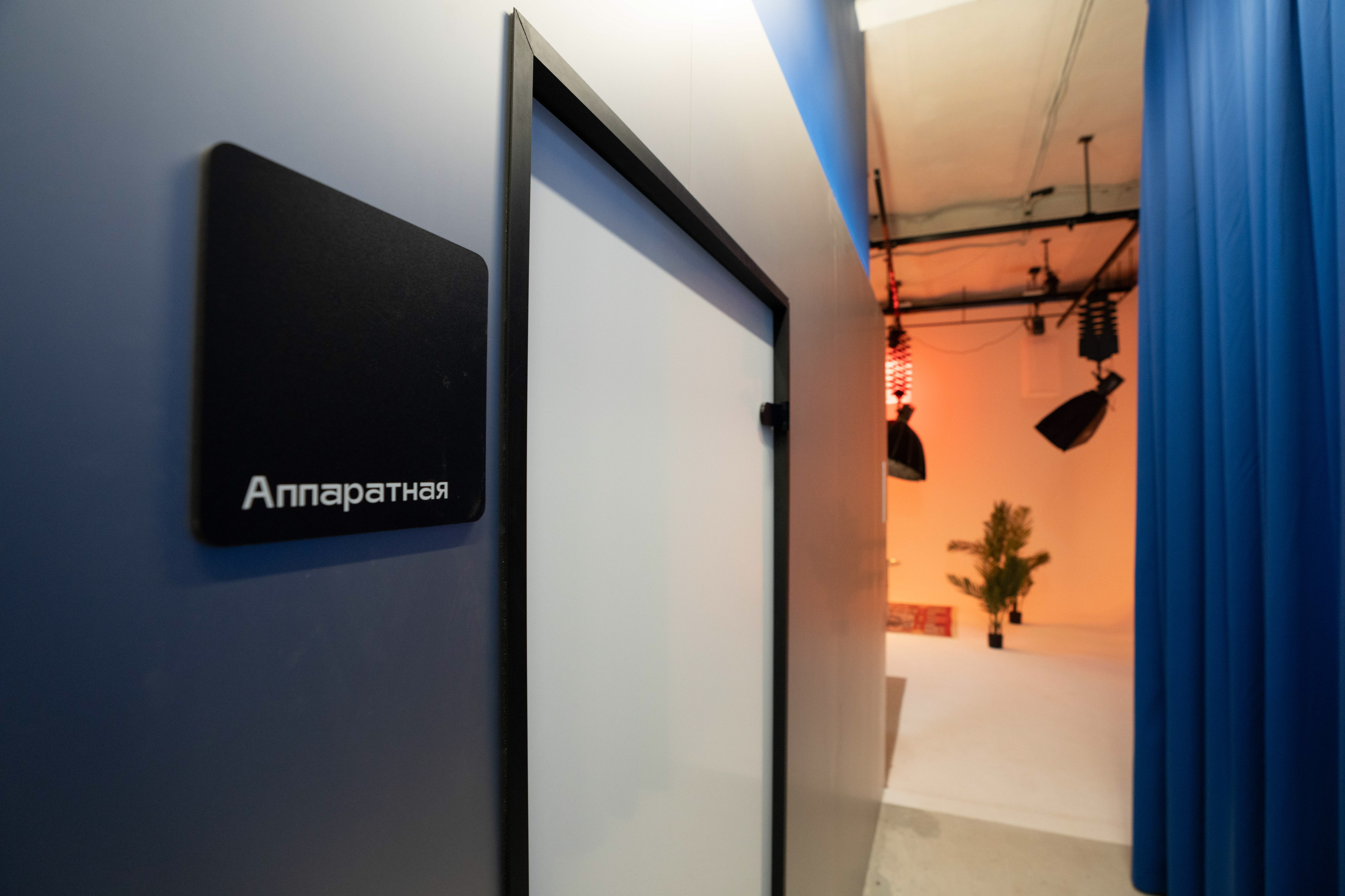 Техническая комната с окном выходит прямо на съёмочную площадку — удобно контролировать процесс.